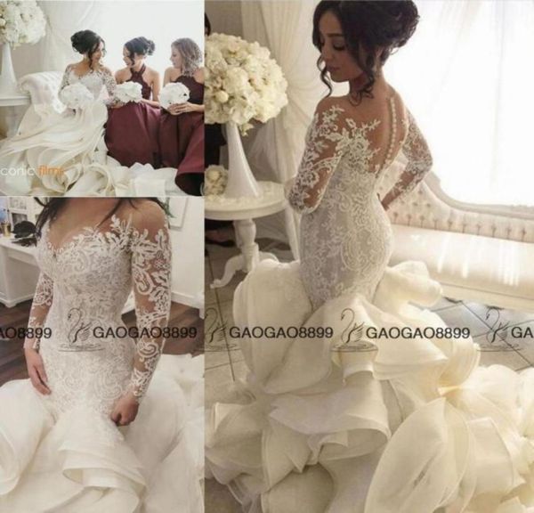 steven khalil 2019 luxury ruffles cathedral train mermaid wedding dresses with long sleeves middle east plus size lace organza wed7986487, White