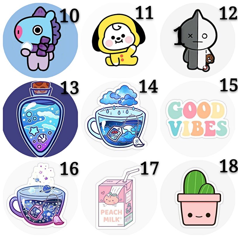 Produk= sticker bt21 dan varian lainnya size= 5x5 (bentuk bulat)