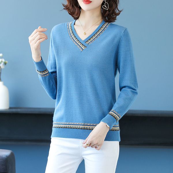 stripes patchwork v-neck sweaters for women elegant loose knitwear femme casual long sleeve large size knitted pullovers 210522, White;black