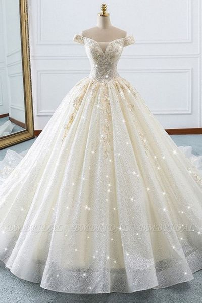 stunning designer sequined tulle wedding dresses elegant off shoulders appliques beads with corset back long bridal gowns luxury bc15252, White