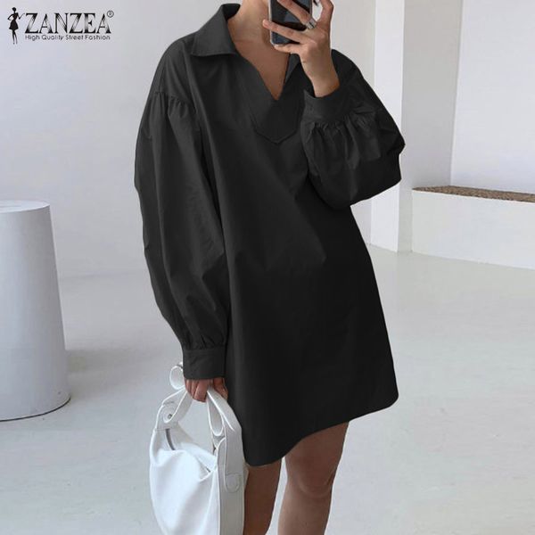 stylish summer dress women's sundress zanzea casual puff sleeve v neck shirt vestidos female button mini tunic robe oversized, Black;gray