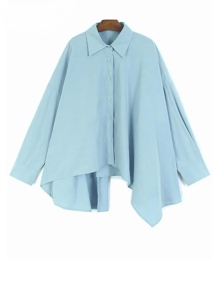 Women Blue Irregular Hem Big Size Casual Blouse New Lapel Long Sleeve Shirt Fashion Tide Spring Autumn