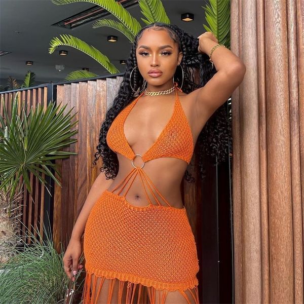 summer boho beach two pieces sets womens knit sleeveless crop tassel skirts backless suits party outfits 220527, White