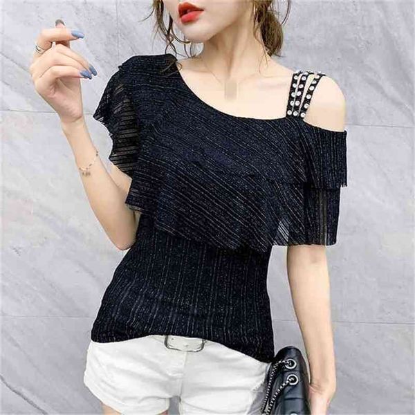 summer european clothes t-shirt shiny skew collar rivet women ropa mujer fashion short sleeve stretchy tees t06218 210722, White
