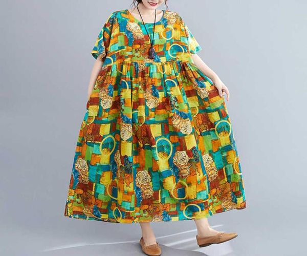 summer fashion fat mm200 kg plus fat plus size shortsleeved round neck print loose casual literary dress women 2105279461707, Black;gray
