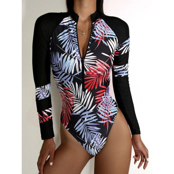 summer print one piece swimsuit long sleeve swimwear sports women's swimming bathing suit beach bather surfing swim wear 2021 one-piece