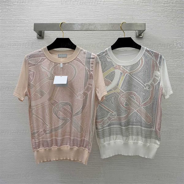 summer tee shirt designer lady tshirt 100% silk twill patchwork geometric printed crew neck pullover short sleeve knit sweater women t shirt, White