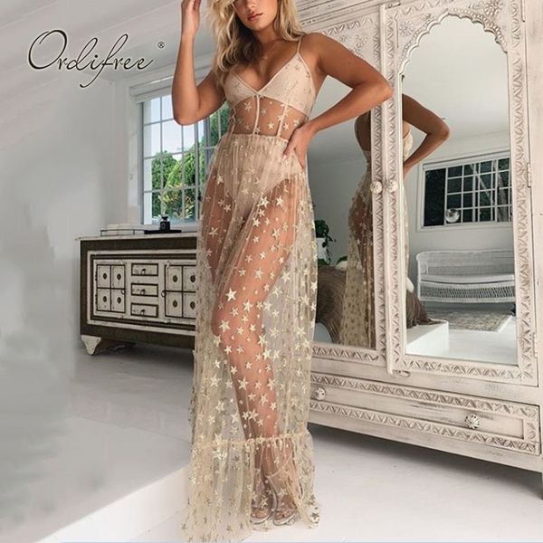 summer women long beach spaghetti strap stars print transparent sleeveless mesh maxi dress 210415, Black;gray