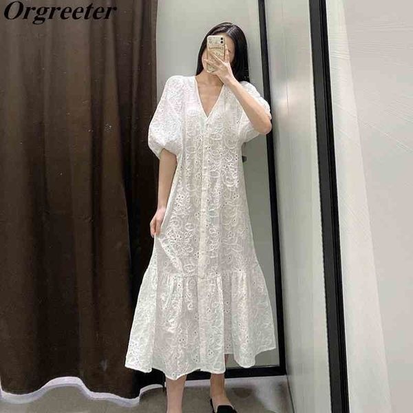 summer women white embroidery cotton dress for v-neck puff sleeve single-breasted hollow out pleated hem beach 210525, Black;gray