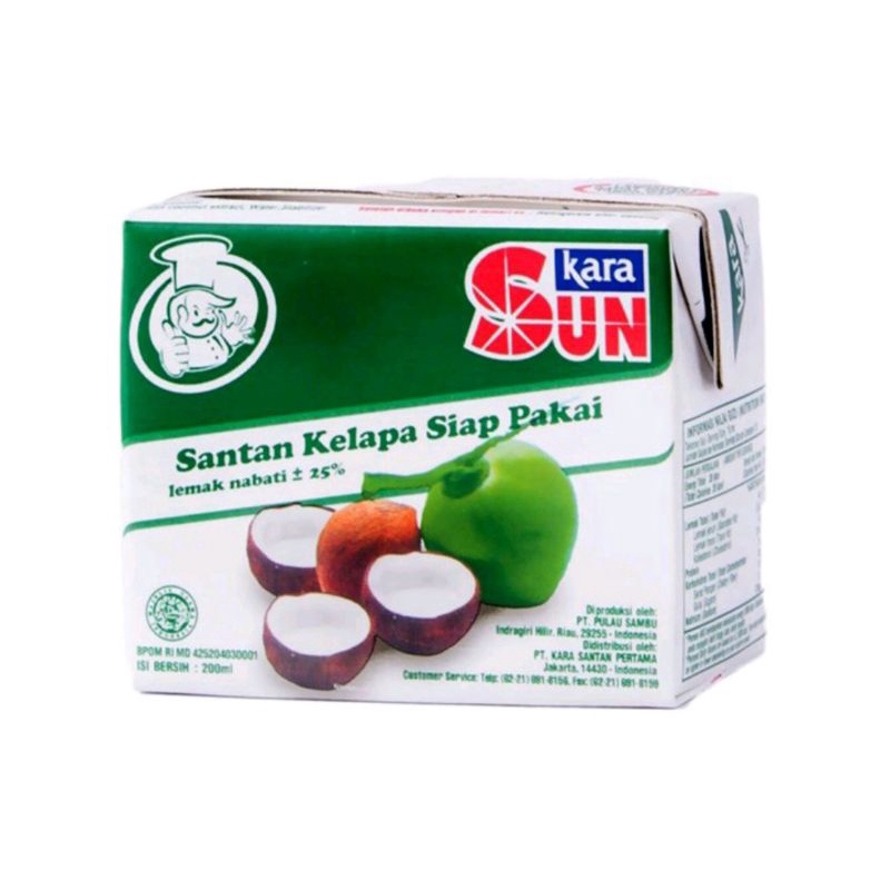 Kara Sun Santan Kelapa [200 mL] merupakan santan kelapa siap pakai yang terbuat dari air kelapa yang dikukur, diolah dan dikemas secara modern & higienis menggunakan sterilisasi tinggi (UHT), sehingga kesegaran & keaslian santan terjaga dengan baik, serta membuatnya tahan disimpan dalam waktu lama di dalam kulkas. Mengandung lemak nabati kurang lebih 25% dan juga dibuat tanpa pengawet sehingga aman digunakan. Jadikan Santan ini sebagai pengganti alternatif santan kelapa tradisional untuk menghasilkan masakan lezat bagi keluarga tercinta. Cocok digunakan untuk satu kali memasak, untuk 4-5 porsi.