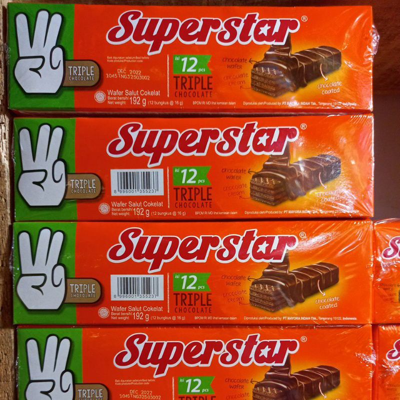 Superstar wafer Stick Cokelat 192 gr merupakan salah satu varian wafer stick dari Mayora yang dibuat dengan memadukan resep rahasia original dari ahli pembuat cokelat dan bahan-bahan pilihan berkualitas untuk menghasilkan wafer stick renyah yang memiliki kemurniaan, kelembutan, dan kesempurnaan rasa. Wafer stick ini terdiri dari kombinasi wafer krispi, krim cokelat premium yang nikmat, dan susu lezat di setiap gigitannya, memberikan sensasi menikmati coklat premium yang tak terlupakan. Diproduksi dengan teknologi modern dengan bahan-bahan berkualitas sehingga menghasilkan wafer stick sebagai camilan yang pas dan bermutu baik.
