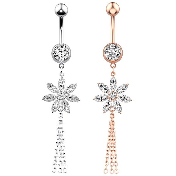surgical steel belly ring body jewelry crystal zircon flower dangle button navel piercing ring, Silver