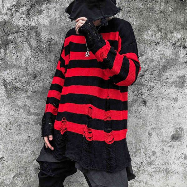 sweater knit guochao black and red striped jacquard crew neck men's women's gaojiechao hip hop long sleeve t shirts with holes, White;black