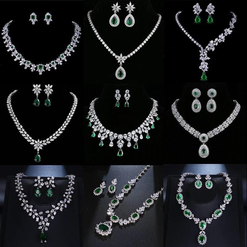 Классические роскошные зеленые серьги с фианитом, комплекты ожерелья для женщин, ослепительные свадебные аксессуары