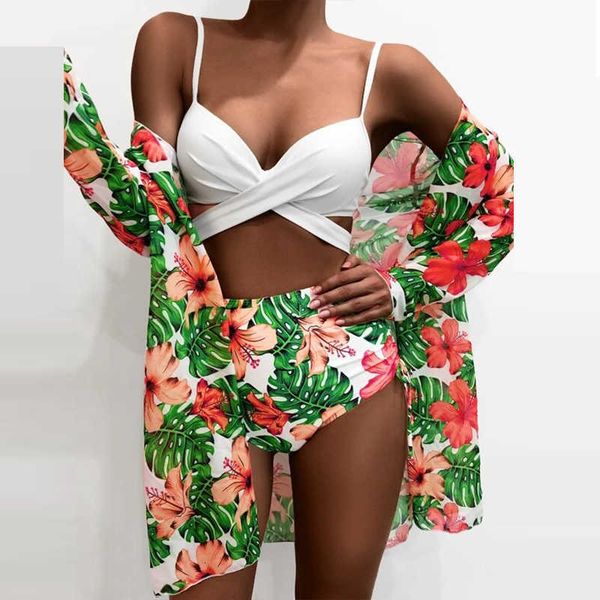 swimwear 3 piece bikini set swimsuit straps bra + cardigan bathing suit 2021 fashion women casual printed bikinis, White;black