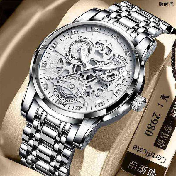 swiss automatic hollow out mechanical fashion steel men's luminous calendar waterproof simple watch, Slivery;brown