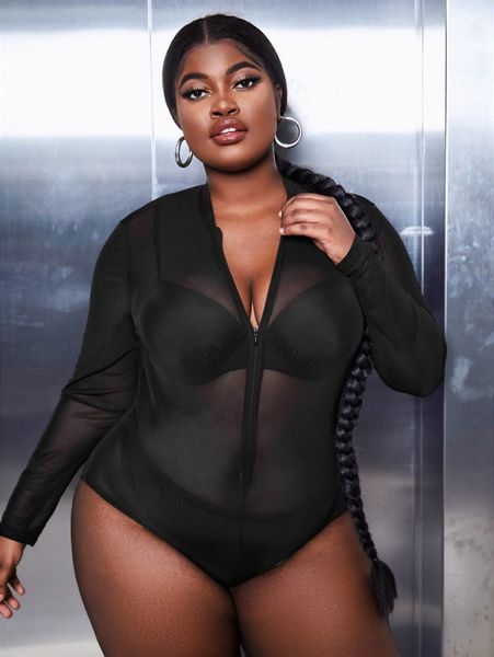 sxy plus zip up sheer bodysuit 14ym#, Black