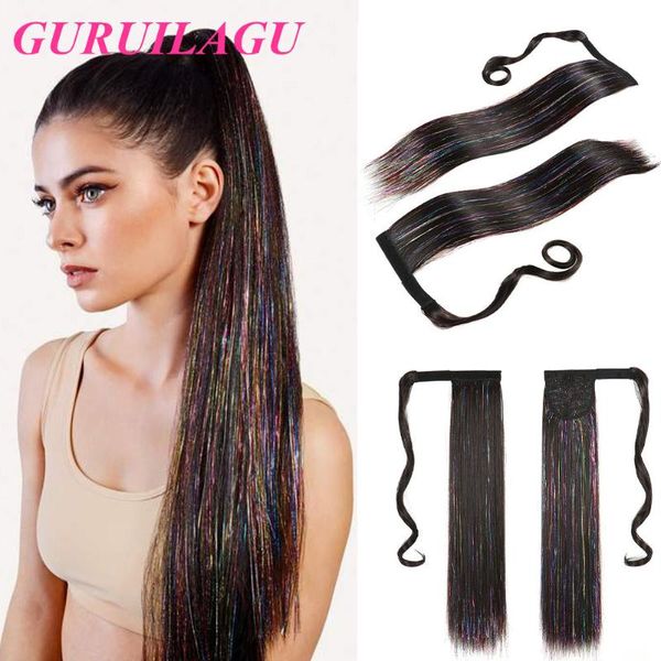 synthetic wigs guruilagu straight wrap around clip in ponytail hair colorful heat resistant pony tail fake, Black