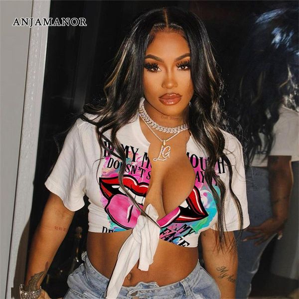 t-shirt anjamanor graffiti letter print white crop for women street fashion tie up short sleeve tshirts graphic tees d87cd19