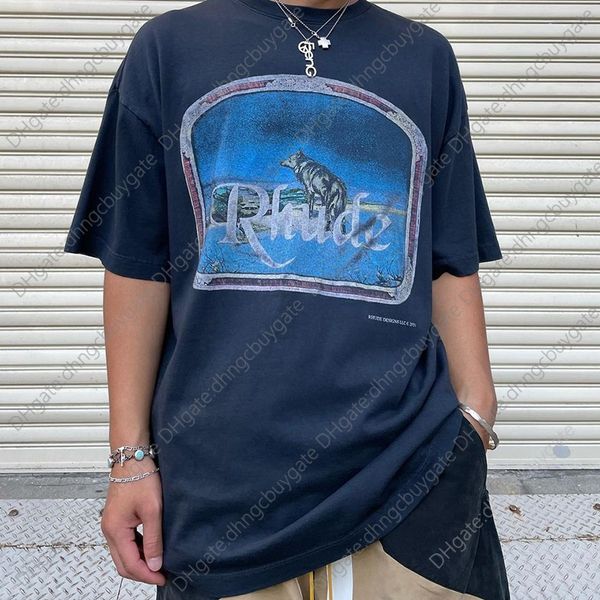 t shirt designer rhude tide brand lone wolf and wild printed high street loose oversize street hip hop short sleeve female couple t-shirt ma, White;black