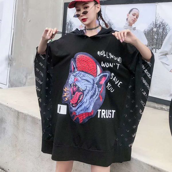 t shirt fashion brand women's 2021 summer cartoon pin bead stitching ruffle hip hop mid long hooded, White
