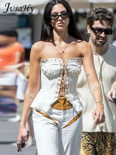 tanks jusahy women solid england style bandage chest strapless ruffle hem skinny vest high street preppy style short top, Black;white