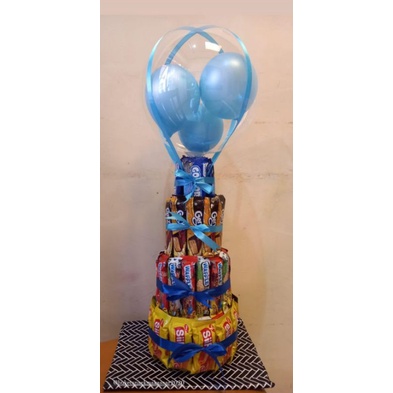 tart snack berisikan snack waffle, gery, yupi, dan sip beserta pelengkap balon transparan
