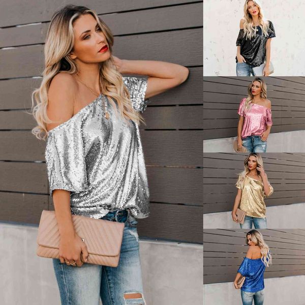 tee women sequins t-shirts off the shoulder glitter sparkle t shirt short sleeve they'll see female black-size ladies'black pink, White