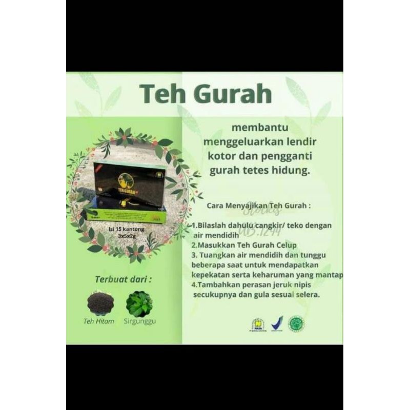 TEH GURAH NASA terbuat dari daun Teh dan Sirgunggu, dalam teh juga mengandung serat kasar sehingga lebih banyak mengandung Vitamin A, serta mengandung Mineral dan Zat besi yang sangat di butuhkan oleh tubuh manusia.