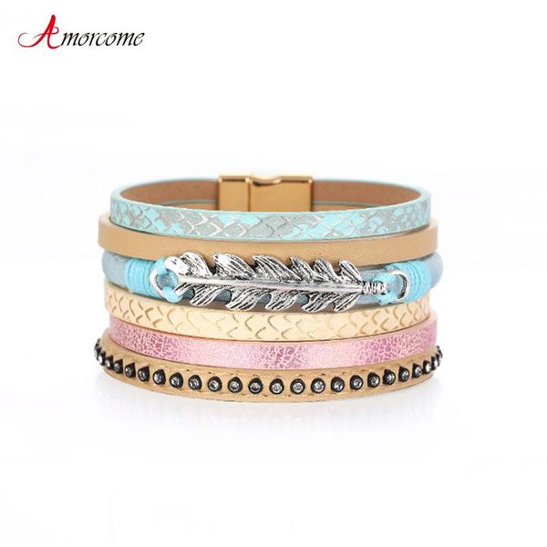 tennis amorcome fashion geometric metal leaf charm pu leather bracelets womens multilayer wide wrap bracelet bangle jewelry femme, Golden;silver