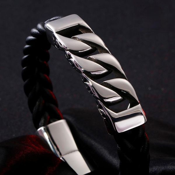tennis jewels store stainless steel cuban chain bracelet men 21cm cowhide woven leather wrap armband jewelry for man, Golden;silver