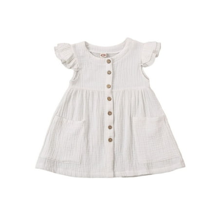 Toddler Kid Baby Girl Summer Dress Ruffles Sleeves Cotton Linen Party Children Girls Casual Button Pocket Dress Sundress Clothes