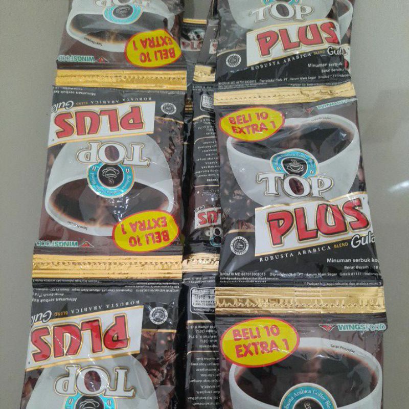 top plus gula isi 10 saset kopi berat 18g per saset nya.stok melimpah.packing standar plastik.pembelian 100k baru free packing kardus.