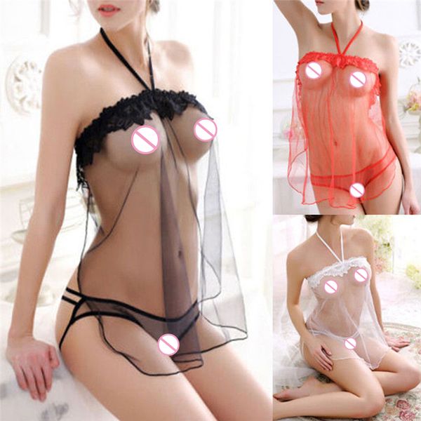 transparent lace lingerie nightwear dresses women sleepwear with g-string, Red;black