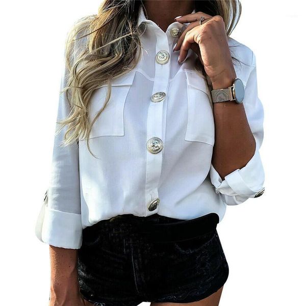 trendy women clothes loose pocket turn-down collar blouse long sleeve button solid casual polyester shirts one pieces women's blouses &, White