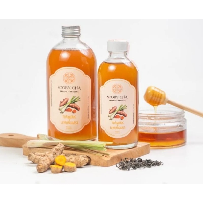 Minuman kombucha varian kunyit & sereh dari bahan alami dari teh & madu asli.
