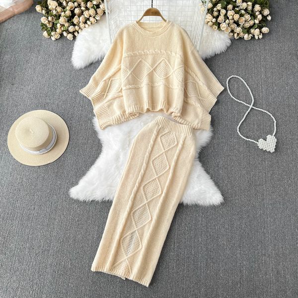 two piece dress autumn winter korean women knitted 2 piece set batwing sleeve loose slim bodycon skirt female sweater suits 230421, White