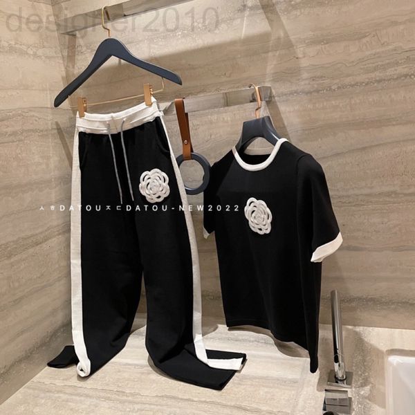 two piece dress designer xiaoxiangfeng camellia heavy industry nail bead short sleeved knitted cotton drawstring wide leg pants two-piece wo, White