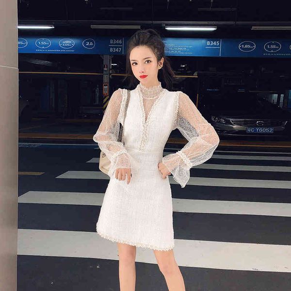 two piece dress elegant lace piece sweet sets women stand collar flare sleeve pearl shirt + hight waist beaded tweed slim mini suits 4avl, White