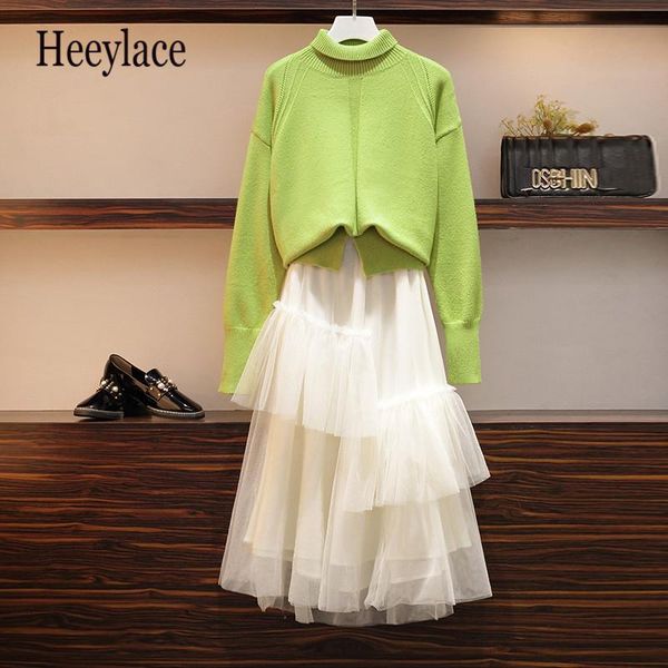 two piece dress plus size women 2 set 2021 winter clothes elegant outfits casual knitted sweater irregular mesh skirt 2pcs, White