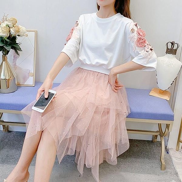 two piece dress women 2 embroidery floral 3d appliques and mesh skirts suits elegant sequin skirt sets sequined fall female, White
