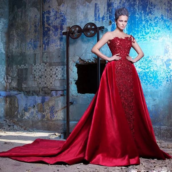 unique red sheath evening dresses sheer neck short sleeve full lace celebrity gown detachable train formal evening wear, Black;red