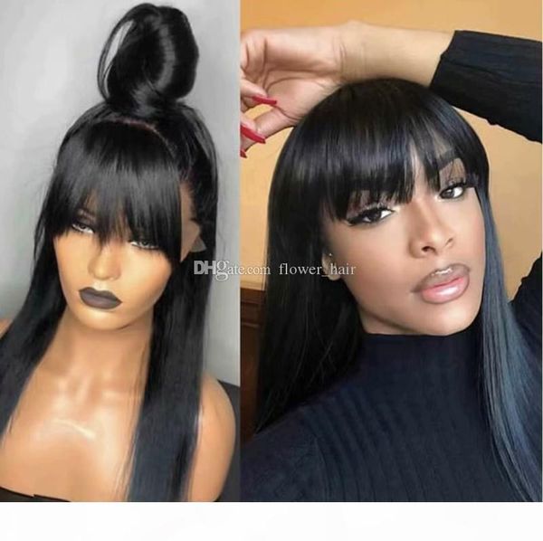 unprocessed peruvian human hair silky straight bleached knots silk full lace wigs with full bangs baby hair, Black;brown