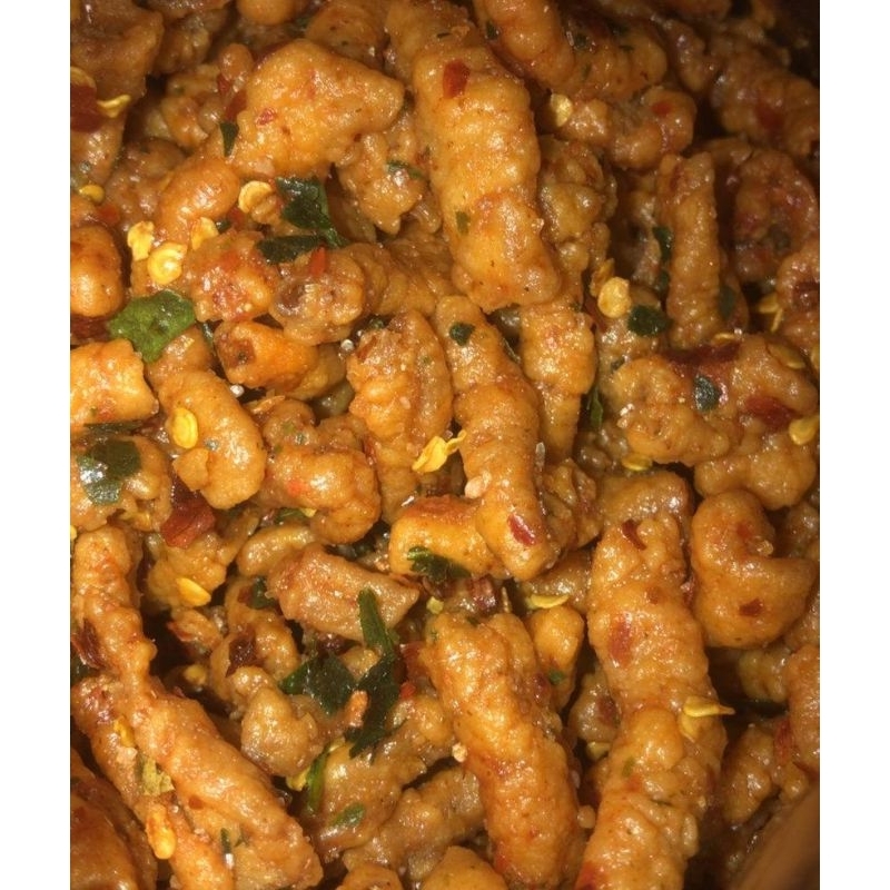 usus crispy dengan bumbu pedas gurih daun jeruk.