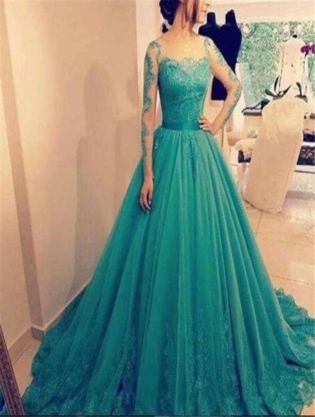 vestidos de festa 2019 elegant ball gown evening dresses sheer long sleeves tulle prom dress lace appliques floor length formal pa5215203, Black;red