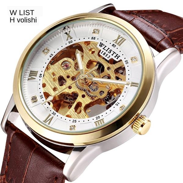 volishi watch men's mechanical automatic waterproof luminous steel belt fashion double-sided hollow wristwatches, Slivery;brown