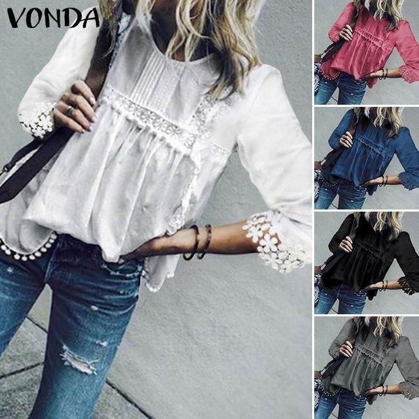 vonda womens and blouses summer hollow out blouse bohemian casual 34 sleeve blusas solid shirt plus size tunic y200402, White
