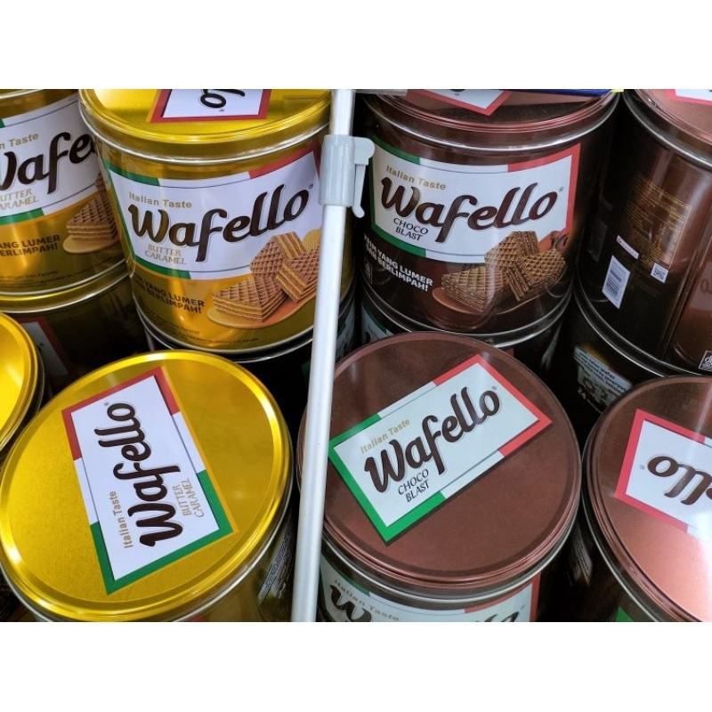 wafello wafer kaleng rasa coklat dan karamel, perkarton isi 6 kaleng...