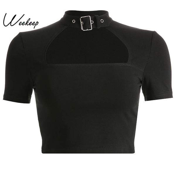 weekeep cropped hollow out t shirt women adjustable o-neck short sleeve t-shirt summer streetwear tee shirt femme y200111, White
