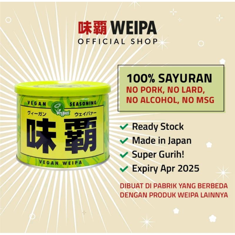 - Weipa Vegan tidak mengandung MSG atau bahan kimia apapun. Makanya tanggal kadaluarsa juga tidak sampai bertahun2. Karena ini dilarang oleh Depkes Jepang.